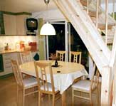 Zur Ausstattung gehören u.a. eine moderne Einbauküche mit 4 Cerankochfeldern, Backröhre, Geschirrspüler, einem 200-Liter Kühlschrank mit Eisfach, Wasserkocher, Kaffeemaschine, Toaster sowie ein umfangreiches Sortiment an Geschirr, Besteck und sonstigem Küchenzubehör. Für kleinere Kinder stehen jeweils ein erhöhter Kinderstuhl und ein Baby-Stühlchen bereit. Das Farb-TV (Sat) befindet sich ebenfalls in der Küche. |