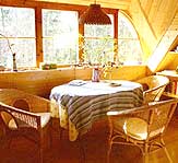 Neben den Sitzbereichen finden Sie hier die Mini-HiFi-Anlage mit CD & MC. Zwei in die Dachschrägen eingebaute Wandschränke bieten Ihnen reichlich Stauraum. Der teilweise Wandausbau in Holz und der Parkettfußboden sorgen für eine behagliche und dennoch unverschnörkelte Atmosphäre. Insbesondere die Sitzgruppe am Fenster der Dachgaube bietet Ihnen einen wunderschönen Blick auf die Natur außerhalb. |